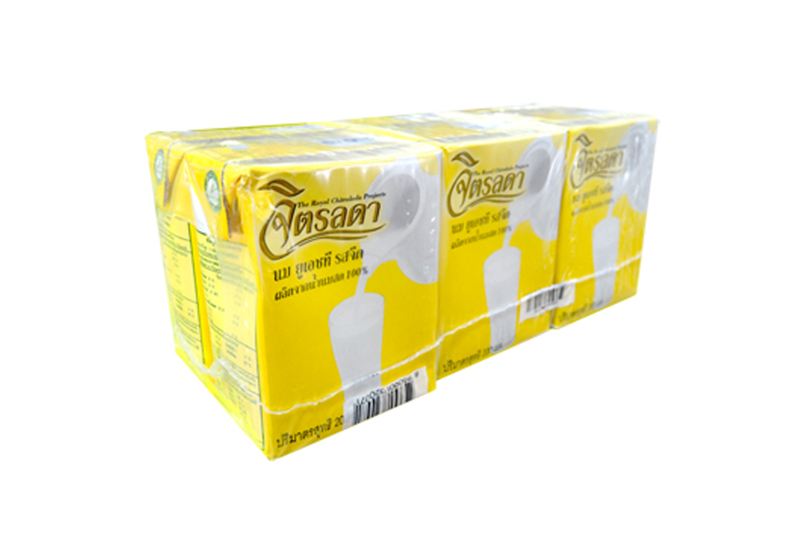 นมกล่องที่ตีตราสวนจิตรลดานี้ก็มีจุดเริ่มต้นเดียวกันกับนมอัดเม็ดสวนดุสิต คือวิกฤตน้ำนมดิบล้นตลาดเมื่อปี พ.ศ. 2545 โรงโคนมสวนจิตรลดา จึงได้ก่อสร้าง “โรงนมยูเอชที สวนจิตรลดา” เพื่อช่วยเหลือเกษตรกรและสหกรณ์โคนม โดยโครงการนี้มีจุดมุ่งหมายเพื่อเป็นตัวอย่างแก่เกษตรกรโคนมและปรับปรุงการรีดนมแบบเดิม รวมทั้งเป็นตัวอย่างโรงนมแบบครบวงจรของอุตสาหกรรมนม จนกลายมาเป็นนมยูเอชทีกล่องสีเหลืองจากนมโคแท้ 100% ในปัจจุบัน