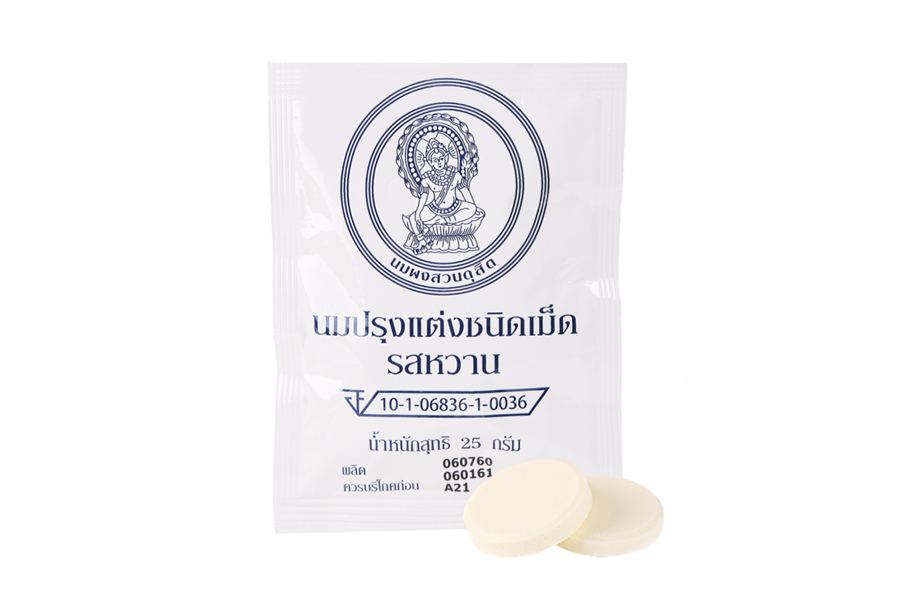 โดยเริ่มแรกเป็นโรงงานแปรรูปนมโคสดเป็นนมผงก่อน ต่อมาจึงได้มีการต่อยอดผลิตภัณฑ์ ด้วยการนำนมผงมาแปรรูปเป็น “ทอฟฟี่รสนม” แต่ทอฟฟี่รสนมไม่ได้รับความนิยมอย่างที่คิด ทางโรงนมผงสวนดุสิตจึงได้เปลี่ยนวิธีการแปรรูปอีกครั้งด้วยการนำเครื่องตอกเม็ดยามาตอกนมผงให้เป็นเม็ดเมื่อปี พ.ศ. 2512 และปี พ.ศ. 2527 โครงการส่วนพระองค์ สวนจิตรลดาได้ก่อสร้าง โรงนมอัดเม็ดขึ้นใหม่ เพื่อผลิต “นมอัดเม็ด” อย่างที่เราคุ้นเคยในปัจจุบัน