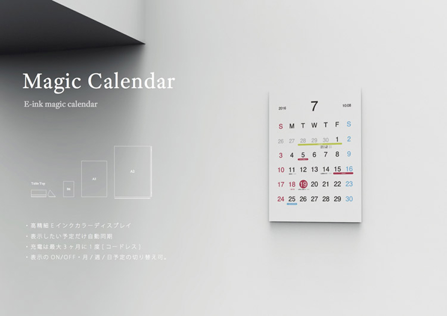 Magic Calendar เป็นปฏิทินดิจิตอลที่ทำมาจากกระดาษอิเล็กทรอนิกส์บางเฉียบ ที่มีความสามารถเชื่อมต่อกับสมาร์ทโฟน โดยหน้าที่หลักของปฏิทินดิจิตอลนี้คือ การแสดงตารางนัดหมายหรือตารางกิจกรรมของเรา โดยที่เราไม่จำเป็นต้องก้มดูจากสมาร์ทโฟน ซึ่งจากความสามารถนี้เอง ทำให้เราสามารถแชร์ตารางเวลากับคนรอบข้างได้ง่ายขึ้น โดยเฉพาะเมื่อ Hironao Tsuboi ตั้งใจออกแบบปฏิทินดิจิตอลนี้เพื่อแชร์ตารางงานกับภรรยา แม้ทั้งคู่จะอยู่ในสถานที่ห่างไกลกัน