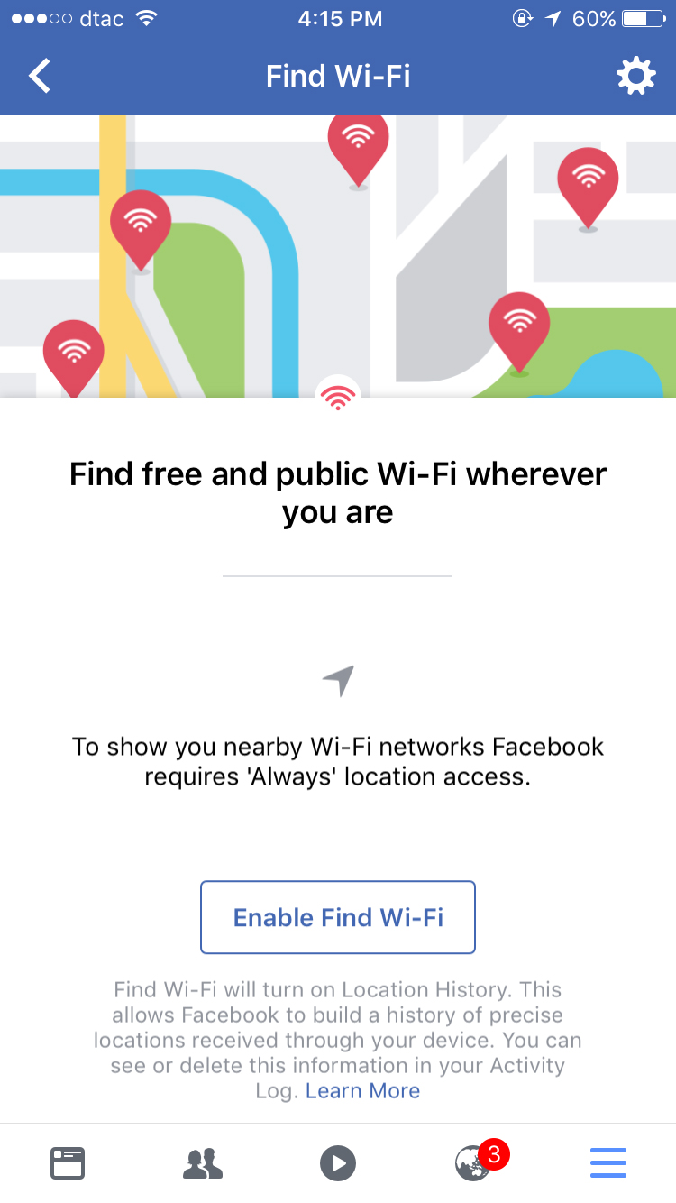 อีกหนึ่งฟังก์ชั่นของคนที่ต้องการใช้งานอินเทอร์เน็ตแบบฟรีๆ กับฟังก์ชั่น Find free Wi-Fi ซึ่งฟังก์ชั่นนี้มีเฉพาะบนแอปพลิเคชั่นเช่นเดียวกับ Nearby Place โดยให้เราไปที่ More แล้วเลื่อนหน้าจอลงไปจนเห็นไอคอนไวไฟสีชมพู ที่มีคำกำกับว่า Find Wi-Fi เพียงเท่านี้เราก็มีสัญญาณไวไฟฟรีมาใช้งานได้แล้ว
