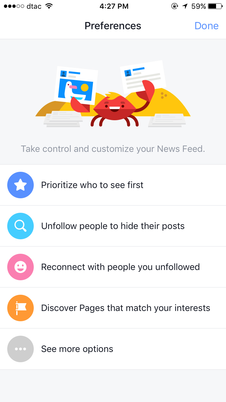 เราสามารถเลือกได้ว่าอยากให้ News Feed ของเราปรากฏเรื่องราวใดบ้าง ด้วยการจัดการกับ News Feed ซึ่งเราสามารถตั้งค่าได้ตั้งแต่การจัดลำดับความสำคัญเพื่อน การยกเลิกการติดตามของเพื่อนบางคน (unfollow เพื่อนบางคนนั้นเอง) เพื่อซ่อนโพสต์ของเขาไม่ให้เห็นใน News Feed ของเรา โดยการ unfollow นี้จะมีแต่เราเท่านั้นที่รู้ ในทางกลับกันหากคุณอยากย้อนกลับไปติดตามเพื่อนที่คุณ unfollow ไปแล้วอีกครั้งก็สามารถทำได้ อีกทั้งฟังก์ชั่นนี้ยังทำหน้าที่เป็นคนรู้ใจด้วยการเสนอ Pages ที่ตรงกับความสนใจของเรา โดยวิธีการตั้งค่าคือ