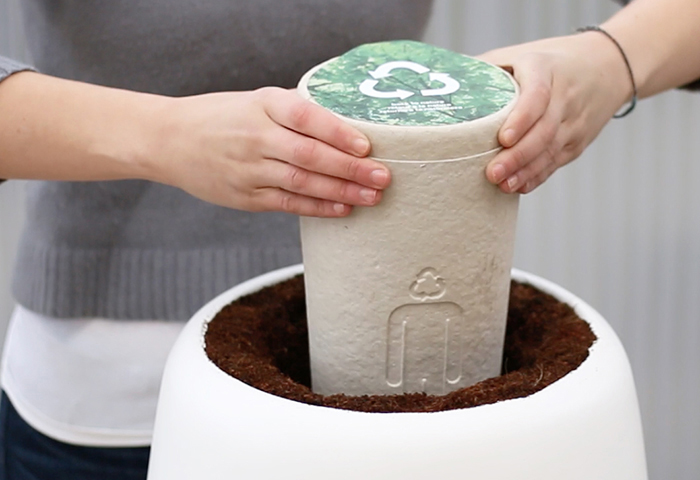 1. เปิดฝา Bios Urn แล้วนำเถ้ากระดูกของคนที่คุณรักใส่ลงไป รวมถึงฝังเมล็ดพันธุ์ต้นไม้ ปิดฝาแล้วฝังลงไปใน Bios Incube ที่มีดินล้อมรอบ