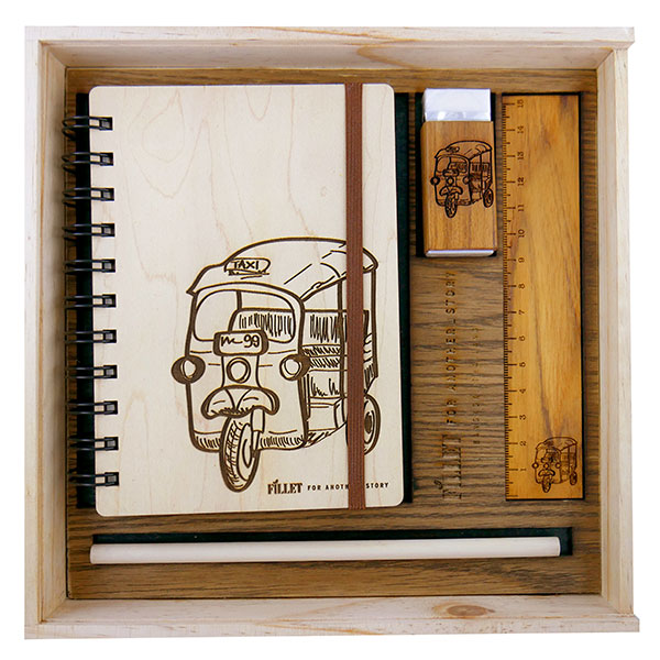 ชุดเครื่องเขียนไม้ พร้อมกล่องฝาสไลด์ไม้ ลายรถตุ๊ก-ตุ๊ก