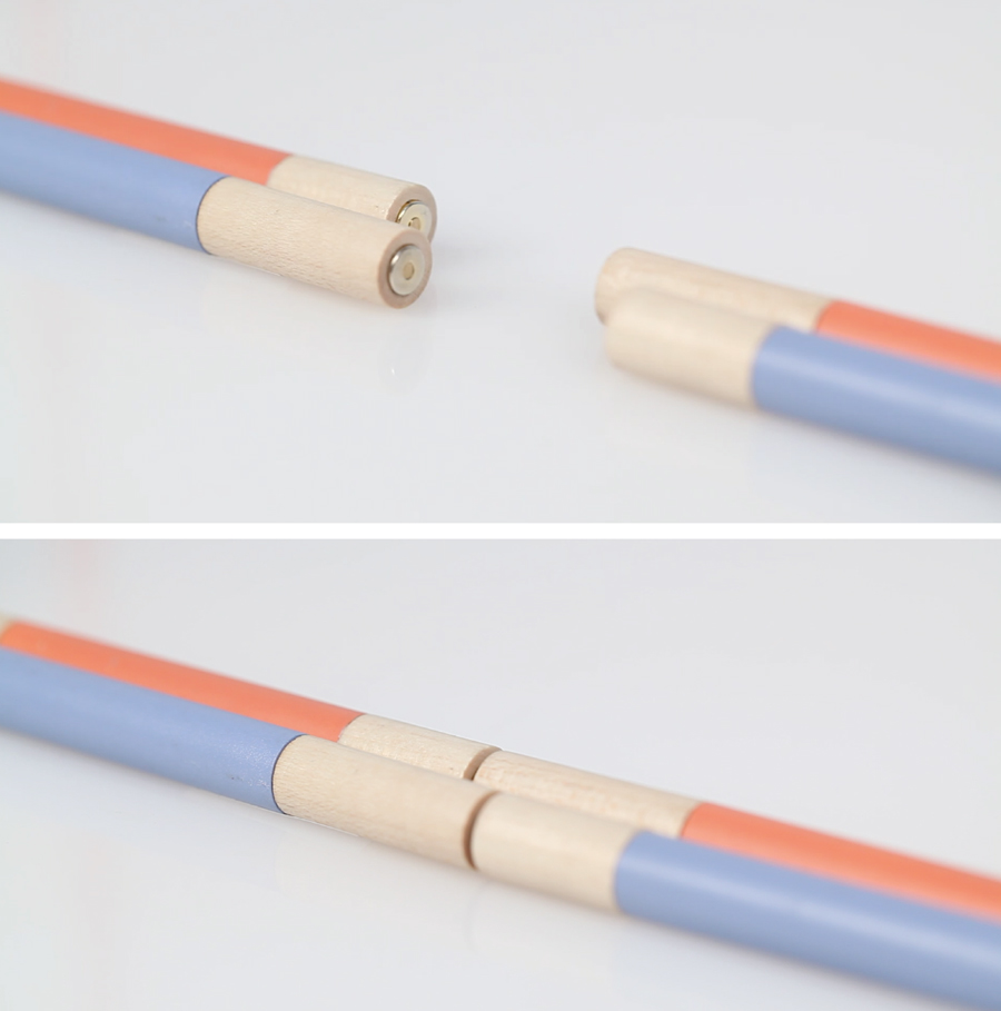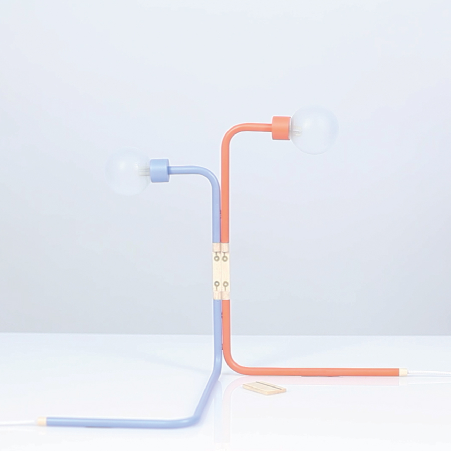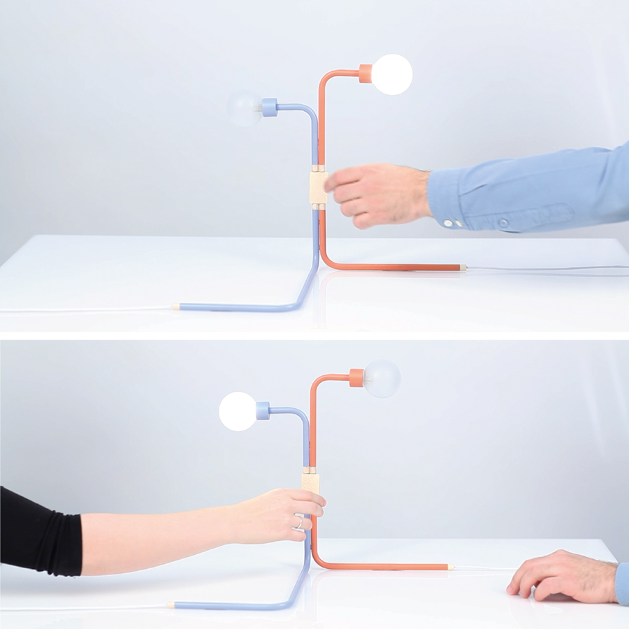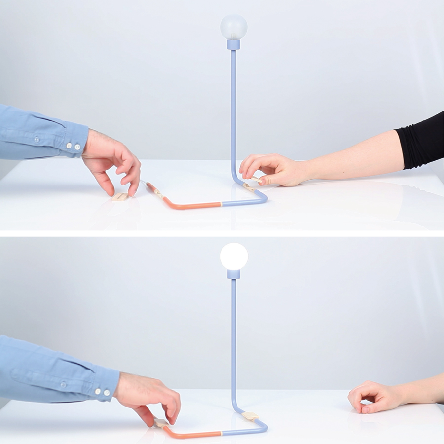 โคมไฟที่มีชื่อยาวๆ ว่า “A Play of Dependencies” ชิ้นนี้ เป็นโคมไฟที่มีระบบเปิด-ปิดแบบการเล่นแร่แปรธาตุ นั่นเพราะ Maya Pindeus และ Johanna Pichlbauer สองนักออกแบบได้ดีไซน์โคมไฟชิ้นนี้ให้มีการทำงานที่ต้องอาศัยสองขั้วแม่เหล็กที่แตกต่างกัน ซึ่งจะให้ผลลัพธ์แตกต่างกันด้วย โดยการทำงานนี้จะขึ้นอยู่กับตัวแปรที่ 3 นั่นคือ ‘ข้อตกลงและความร่วมมือของคนสองคน’ ที่ต้องมาร่วมมือควบคุมวงจรไฟฟ้า และต้องใช้โคมไฟสองชิ้นเพื่อเชื่อมต่อกันจึงจะใช้งานได้ (แต่ถ้ามีชิ้นเดียวก็เปิดปิดวงจรไฟฟ้าได้เช่นกัน โดยอาศัยแผ่นขั้วบวกลบที่ออกแบบมาเพิ่มเติม)