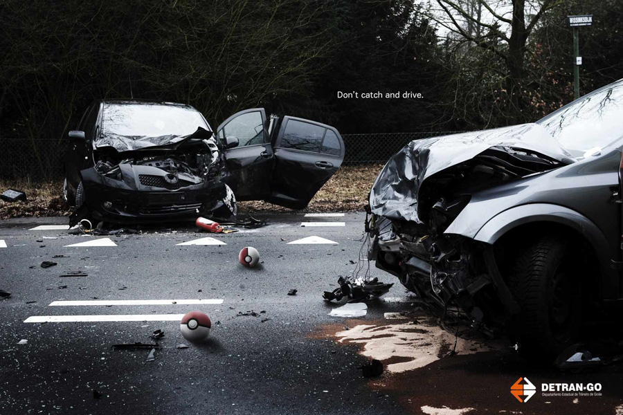 ล่าสุดองค์กรการกุศลของประเทศบราซิลอย่าง DETRAN-GO ได้เผย Ads ที่สะท้อนถึงการใช้เจ้า Pokémon Go อย่างไม่ระมัดระวังในขณะขับรถ จนก่อให้เกิดอุบัติเหตุอันน่าสยดสยองเกิดขึ้น ในแคมเปญที่ว่า Don’t catch ซึ่งภายในเป็นภาพอุบัติเหตุทางรถยนต์ที่เกิดขึ้นจากการเล่น Pokémon Go พร้อมทั้งข้อความ Don’t catch and drive ที่มีความหมายว่าไม่จับโปเกมอนในขณะขับรถนั่นเอง