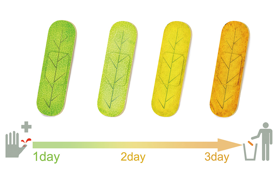 การที่พลาสเตอร์ The Leaf-band-aid เปลี่ยนสีได้นี้ ไม่ได้ทำขึ้นความเก๋ไก๋หรือสนุกเพียงอย่างเดียว แต่การเปลี่ยนสีทำหน้าที่เป็นสัญญาณเตือนให้เราเปลี่ยนพลาสเตอร์ได้แล้วนั่นเอง ซึ่งไอเดียนี้เริ่มมาจากการที่เรามักลืมหรือไม่แน่ใจว่าควรเปลี่ยนพลาสเตอร์ที่ปิดแผลเมื่อไรดี ดังนั้นทีมนักออกแบบ 5 คน Ye Wenzai, Yang Lei, Mai Rijin, Geng Yazhen, และ Du Jiachen จึงได้ใช้วัสดุพิเศษที่ตอบสนองต่ออุณหภูมิของผิวหนังมนุษย์มาใช้ในการผลิตพลาสเตอร์ ซึ่งทำให้พลาสเตอร์นี้ค่อยๆ เปลี่ยนสี เพื่อเป็นสัญญาณเตือนว่าเราได้ปิดแผลด้วยพลาสเตอร์ชิ้นนั้นนานเท่าไรแล้ว โดยเมื่อผ่านไป 3 วันแล้ว The Leaf-band-aid จะเปลี่ยนเป็นสีน้ำตาล สีที่บ่งบอกเราว่าเราควรเปลี่ยนพลาสเตอร์ได้แล้ว เพราะช่วงเวลา 3 วันคือช่วงเวลาที่แพทย์มักแนะนำให้เราเปลี่ยนพลาสเตอร์ปิดแผล ส่วนข้อดีของการที่พลาสเตอร์เปลี่ยนสีได้นี้คือช่วยหลีกเลี่ยงการติดเชื้อในแผลหรือแผลเกิดการอับชื้นนั่นเอง