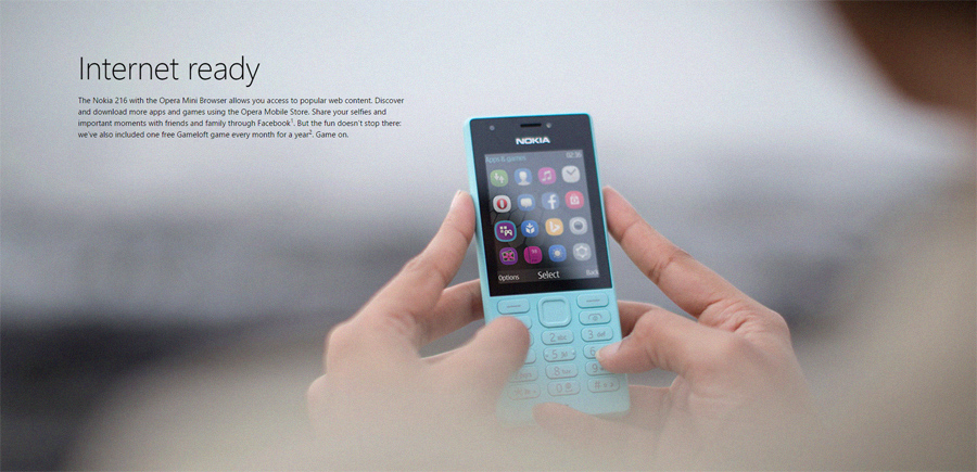 Nokia 216 และ Nokia 216 Dual SIM คือฟีเจอร์โฟนรุ่นล่าสุดที่มาพร้อมกับคุณสมบัติเกินตัวอย่าง หน้าจอสีความละเอียด 2.4 นิ้ว , กล้องถ่ายรูป (ทั้งหน้าและหลังพร้อมแฟลชในตัว) , ฟังวิทยุและรองรับการเล่นไฟล์วิดีโอและไฟล์ Mp3 ได้ , เพิ่มหน่วยความจำแบบ MicroSd สูงสุด 32Gb อีกทั้งยังสามารถแสตนด์บายได้นานเกินครึ่งเดือน นับว่าจัดเต็มกับฟังก์ชั่นที่ให้มาเป็นอย่างมาก