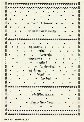 ดร.สุเมธ ตันติเวชกุล เลขาธิการมูลนิธิชัยพัฒนา ได้กล่าวถึง กำเนิด ส.ค.ส. พระราชทานฉบับแรก พร้อมบอกเล่าถึง รูปแบบ ความหมาย คุณค่าที่สอดแทรกอยู่ใน ส.ค.ส. พระราชทานแต่ละปีว่า ส.ค.ส. พระราชทานแห่งองค์พระบาทสมเด็จพระปรมินทรมหาภูมิพลอดุลยเดช ได้ถือกำเนิดขึ้นครั้งแรกโดยมีเนื้อความถึงเจ้าหน้าที่ และสมาชิกผู้เกี่ยวข้อง กส.9 ขอขอบใจทุกคน และถือโอกาสอวยพร ปีใหม่ ด้วยถ้อยคำต่าง ๆ ให้พิจารณา ดังต่อไปนี้
