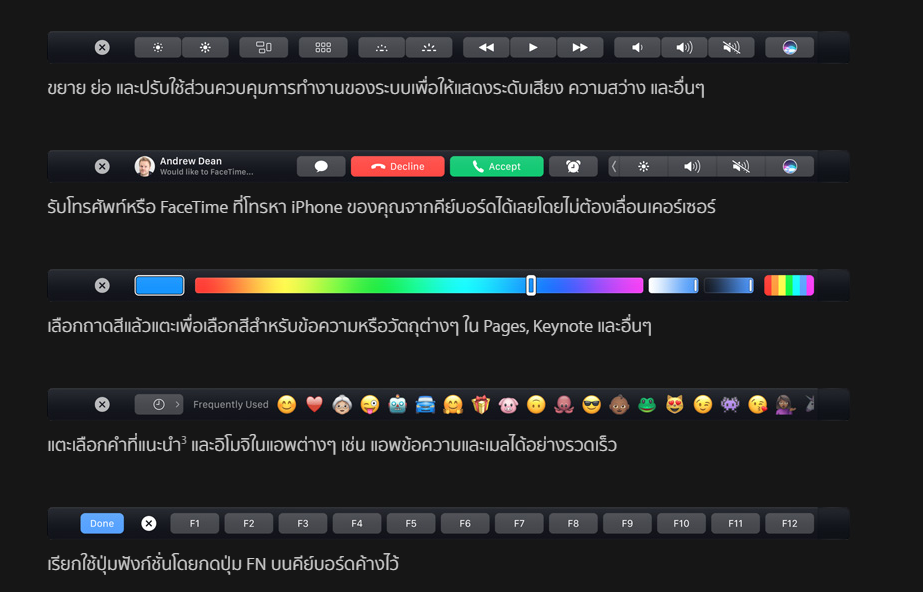 ความล้ำสมัยที่เปลี่ยนแถวปุ่มฟังก์ชั่นแบบเดิมให้กลายเป็นจอภาพ Multi-Touch คุณภาพระดับ Retina® ที่สวยงามในชื่อ Touch Bar แถบกระจกซึ่งได้รับการผสานรวมให้เป็นส่วนหนึ่งของคีย์บอร์ด โดยนำปุ่มควบคุมการใช้งานต่างๆ มาจัดวางในตำแหน่งระดับสายตา เพียงปลายนิ้วสัมผัส และจะปรับเปลี่ยนไปตามความเหมาะสมขณะใช้งานเครื่องหรือแอปพลิเคชั่นต่างๆ อาทิ Mail, Finder, Calendar, Numbers, Final Cut Pro® X และอีกมากมาย รวมถึงแอปของบริษัทอื่นด้วย ตัวอย่างเช่น Touch Bar จะแสดงแท็บและเว็บไซต์โปรดใน Safari, แสดงอิโมจิให้เลือกได้ง่ายขึ้นในแอป Messages, ช่วยให้ปรับแต่งรูปหรือเลื่อนดูวิดีโอขณะอยู่ในแอป Photos ได้อย่าง