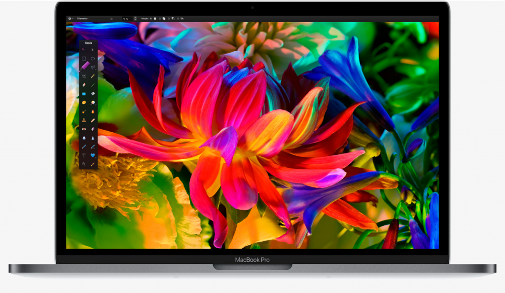 MacBook Pro มาพร้อมจอภาพใหม่ที่ดีที่สุดเท่าที่เคยมีมาในโน้ตบุ๊ค Mac เลยทีเดียว เพราะมีแผงแบ็คไลท์ LED ที่สว่างขึ้นและมีอัตราส่วนคอนทราสต์ที่สูงขึ้น ทำให้สามารถแสดงสีดำได้ดำสนิทยิ่งขึ้น และแสดงสีขาวได้สว่างสดใสยิ่งกว่าเดิม จอภาพ Retina บน MacBook Pro ใหม่มีความบางเพียง 0.88 มม. เท่ากับจอภาพ MacBook และมีความสว่าง 500 นิตส์ หรือสว่างกว่ารุ่นก่อนถึง 67% พร้อมคอนทราสต์ที่สูงกว่ารุ่นก่อน 67% ส่วนรูรับแสงที่ใหญ่ขึ้นในแต่ละพิกเซลและอัตราการรีเฟรชแบบแปรผันก็ช่วยให้ จอภาพประหยัดพลังงานได้มากกว่ารุ่นก่อน