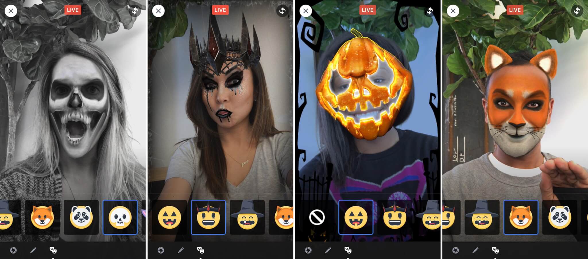 นอกเหนือจากบรรดาปุ่ม Reaction แล้ว ใครที่ชื่นชอบการ Live (แพร่ภาพสด) บน Facebook ต้องได้เฮกันอย่างแน่นอน เพราะทาง Facebook ได้เพิ่มฟีเจอร์ Live Mask ลงไป (คล้ายกับฟังก์ชั่นฟิลเตอร์ใน Snapchat) โดยเมื่อเราทำการ Live จะมีแท็ปไม้เท้าวิเศษบริเวณด้านบนของหน้าจอ เมื่อกดก็จะมีฟิลเตอร์หน้ากากเด้งขึ้นมาให้เลือกบริเวณด้านล่าง ซึ่งหน้ากากต่างๆนั้นก็จะมีตั้งแต่ แม่มด ฟักทอง และอื่นๆอีกมากมาย นับเป็นลูกเล่นเก๋ๆที่เพิ่มความสนุกสนานในการถ่ายทอด Live ได้เป็นอย่างดี