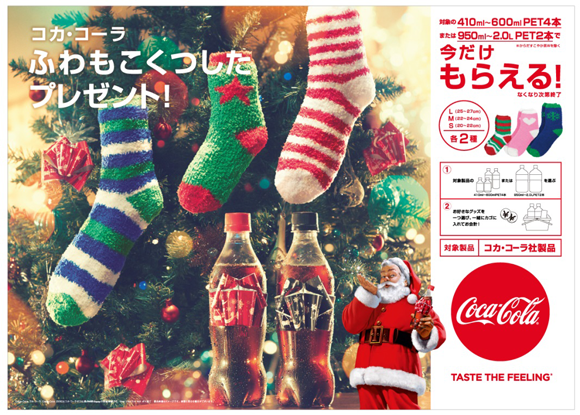 โดยโค้กฉลากพิเศษต้อนรับคริสต์มาสนี้ จะเริ่มวางจำหน่ายตั้งแต่วันที่ 7 พฤศจิกายนเป็นต้นไป ในราคา 140 เยน ซึ่งนอกเหนือจากฉลากพิเศษแล้ว เมื่อลูกค้าซื้อโค้กขวดเล็กจำนวน 4 ขวด หรือ ขวดใหญ่ 2 ขวด ก็จะได้รับถุงเท้าขนหนานุ่มเป็นของแถมสุดน่ารักที่เหมาะกับช่วงเทศกาล (เริ่มแคมเปญแถมถุงเท้าตั้งแต่วันที่ 21 พฤศจิกายนเป็นต้นไป)