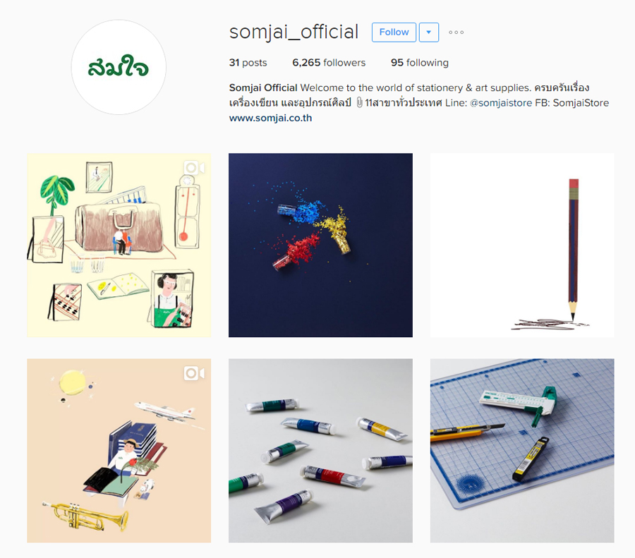 อย่าง Instagram ที่เพิ่งเปิดตัวไปไม่นานกับชื่อ somjai_official ซึ่งอย่างที่เราทราบกันอยู่แล้วว่า Instagram คือพื้นที่โชว์รูปสวย ร้านสมใจก็ไม่ทำให้เราผิดหวังกับความครีเอทรูปภาพเก๋ไก๋ด้วยการนำสินค้าของร้านอย่างเครื่องเขียนมาจัดวางองค์ประกอบภาพเสมือนกราฟฟิกดีไซเนอร์มาเอง ทำให้ภาพที่ได้ทั้งทันสมัย น่าชม และน่าซื้อมากขึ้น ส่วน Facebook นั้นใช้ชื่อว่า