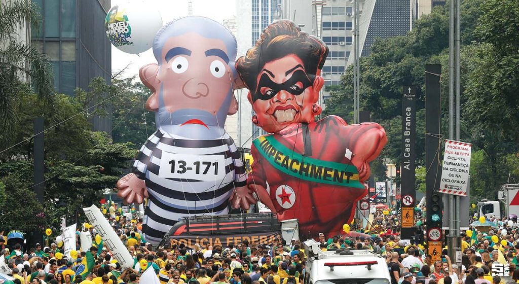 ชาวบราซิลนับล้านคนร่วมชุมนุมประท้วงปลดนาง ดิลมา รุสเซฟฟ์ออกจากการดำรงตำแหน่งประธานาธิบดี เป็นการชุมนุมประท้วงทางการเมืองครั้งใหญ่มากที่สุดเป็นประวัติการณ์ มีผู้เข้าร่วมการชุมนุมในเมืองต่างๆ 400 เมืองทั่วประเทศอย่างน้อย 3 ล้านคนจากการประเมินของตำรวจบราซิล เพื่อแสดงความไม่พอใจต่อภาวะเศรษฐกิจที่ย่ำแย่และปัญหาคอร์รัปชันที่เกี่ยวพันกับบุคคลในรัฐบาล เหตุการณ์ประท้วงที่เกิดขึ้นทำให้วิกฤติทางการเมืองของบราซิลอยู่ในภาวะที่สุ่มเสี่ยง และบีบนางดิลมา รุสเซฟฟ์ ประธานาธิบดีหญิงคนแรกของประเทศให้ต้องก้าวลงจากตำแหน่ง