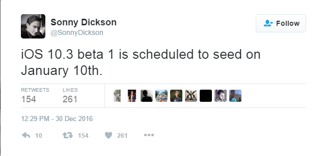 บอกตามตรงว่าเราพึ่งจะอัพเดตเวอร์ชั่น 10.2 ไปไม่กี่สัปดาห์ก่อน พอข้ามเข้าสู่ปี 2017 มาได้เพียงวันเดียว ก็ลือหนาหูว่า Apple จะปล่อยเวอร์ชั่น 10.3 Beta ออกมาอีกแล้ว แล้วทำไมต้องตื่นเต้น เพราะทุกคนก็คิดว่ามันก็เหมือนเดิมๆ ที่ผ่านมา แต่ความเจ๋งนี้ถูกประกาศผ่านข้อความทวีตของ Sonny Dickson ผู้ที่มักจะรายงานเกี่ยวข่าวหลุดของอุปกรณ์ Apple และมันเป็นจริงทุกครั้ง ว่าตัวเวอร์ชั่นใหม่พร้อมปล่อยแน่ 10 มกราคมนี้