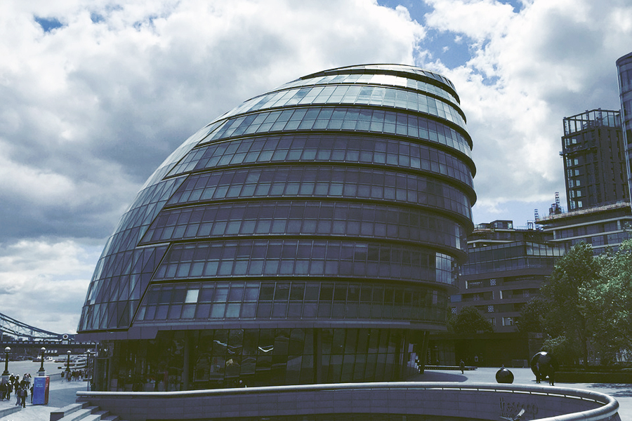 ข้ามมาถึงประเทศตะวันตก มหาอำนาจทางฝั่งยุโรป ศาลากลางเมืองลอนดอน แลนด์มาร์กสำคัญของประเทศอังกฤษ ถูกสร้างขึ้นในปีค.ศ. 2002 ถูกออกแบบให้มีลักษณะรูปร่างที่โค้งมน ลดการปะทะกับแสงแดด ในทางออกแบบสามารถช่วยประหยัดพลังงานกว่าตึกทรงสี่เหลี่ยมถึง 25 เปอร์เซ็นต์