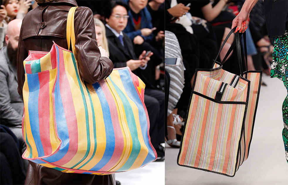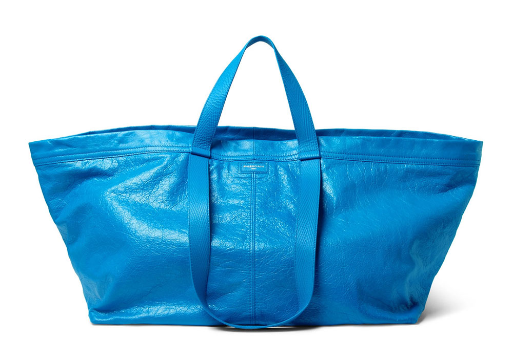 แต่ที่เห็นสะดุดตาคงจะเป็นกระเป๋าใบสีฟ้าโคบอล์ ที่ทั้งสีและรูปทรง ดูยังไงๆ ก็ละม้ายคล้ายคลึงถุงช้อปปิ้งของ IKEA นี่ล่ะ ต้องบอกก่อนว่า ไม่ว่าใครที่ไป IKEA ก็หลงรักกระเป๋าช้อปปิ้งใบใหญ่ ที่หลังจากซื้อกลับบ้านไป คนส่วนใหญ่ก็จะนำกลับมาใช้อีกครั้งเป็นกระเป๋าอเนกประสงค์ ทั้งใส่ผ้าไปซักรีด หรือใช้ขนย้ายอุปกรณ์ขนาดใหญ่ต่างๆ ได้ง่ายในถุงเดียว จากความนิยมของคนส่วนใหญ่น่าจะเป็นอินสไปร์ให้กับแบรนด์ดังได้อย่างดี จากเดิมที่อยู่ในสโตร์ IKEA มีชื่อภาษาสวีดิชว่า ‘ฟรัคตา’ เมื่อล้างน้ำใหม่ใส่ความเป็นแบรนด์ก็ได้รับชื่อสุดหรูว่า Arena Creased-Leather Holdall จากถุงราคา 1 เหรียญดอลล่าสหรัฐ ตอนนี้กลายเป็นใบละ 75,000 ไปแล้ว