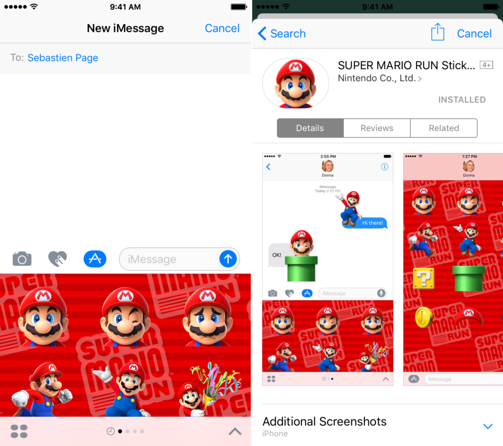 โดยวิธีการโหลดสติ๊กเกอร์ เพียงแค่กดปุ่ม App Store บน Messages แล้วกดปุ่มบวกที่มีคำว่า Store ด้านล่าง จากนั้นก็ทำการดาวน์โหลดสติ๊กเกอร์ที่มีให้เลือกมากมาย แต่ส่วนใหญ่ลวดลายน่ารักคงจะต้องเสียเงินซื้อ แล้วเมื่อต้องการใช้งานเพียงแค่กลับไปที่ปุ่ม App Store บน Messages อีกครั้ง กดปุ่มสี่จุดด้านล่าง จากนั้นเลือกชุดสติ๊กเกอร์ที่โหลดมา แตะที่สติ๊กเกอร์เพื่อส่งได้ทันที นอกจากการส่งสติ๊กเกอร์แล้ว ยังสามารถนำสติ๊กเกอร์เหล่านี้มาใช้ประดับข้อความได้อีกด้วย วิธีใช้คือแตะสติ๊กเกอร์ค้างไว้ และลากไปแปะไว้ที่ข้อความใดก็ได้ที่ต้องการ ก็จะสามารถแปะสติ๊กเกอร์ไว้กับข้อความนั้น ๆ ได้เลย ที่สำคัญช่วงเปิดตัวฟีเจอร์นี้ ก็มีสติ๊กเกอร์ Mario ปล่อยออกมาให้ดาวน์โหลดกันด้วย แม้ขั้นตอนจะดูแสนง่ายและไม่ต่างอะไรกับระบบแชทแพลตฟอร์มอื่นมากนัก แต่ก็ยังมีผู้ใช้จำนวนน้อยดึงฟีเจอร์นี้ออกมา
