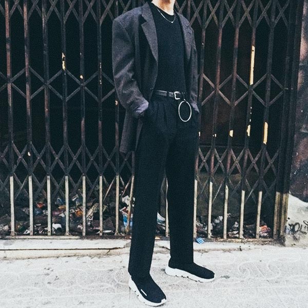 ฉีกกฎเดิมๆที่กางเกงแสล็คต้องใส่คู่กับรองเท้าหนัง ด้วยการนำมาแมทช์กับSock Sneakers ที่ทำให้ได้ลุคกึ่ง Casual กึ่ง Street อยู่หน่อยๆ