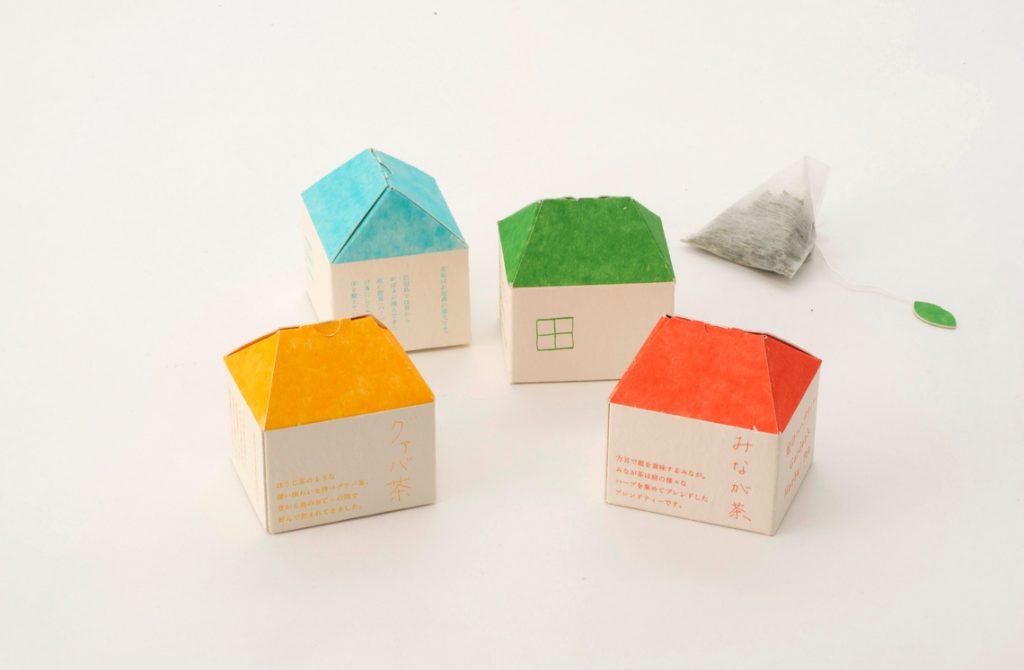 บ้านหลังน้อยหลากสีที่ภายในบรรจุถุงชาสมุนไพรรสดี แต่ละสีผลิตจากวัตถุดิบที่แตกต่างกัน บรรจุรวมอยู่ในกล่องเดียว ออกแบบโดย Tatsuro Hirano และจัดจำหน่ายที่ Shiraho Nichiyoichi