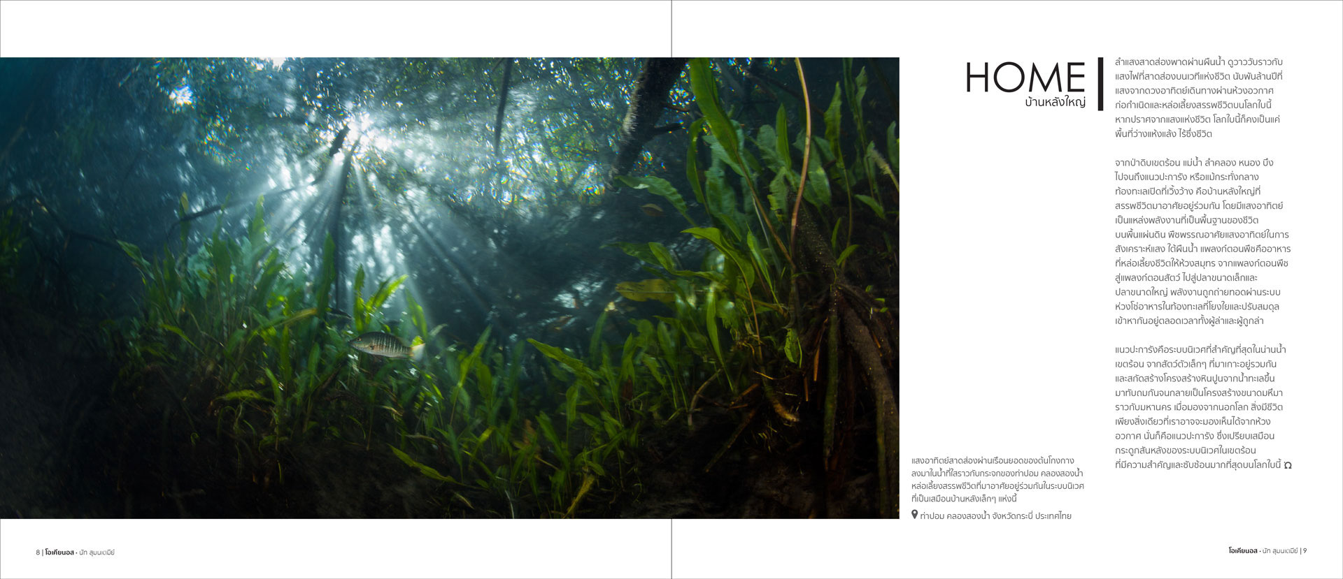 ส่วนหนึ่งจากหนังสือภาพใต้น้ำ โอเคียนอส โดย นัท สุมนเตมีย์ “มหาสมุทร ผืนน้ำอันกว้างใหญ่ที่กินอาณาบริเวณมากกว่าสามในสี่ส่วนของโลกใบนี้ คือสิ่งที่ทำให้โลกของเราแตกต่างไปจากดาวดวงอื่นๆ นับล้านๆ ดวงที่ล่องลอยอยู่ในห้วงอวกาศ