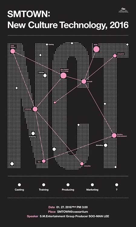 NCT (เอ็นซีที) นั้นย่อมาจาก Neo Culture Technology เป็นโปรเจคที่แตกต่างจากบอยแบนด์ปกติทั่วไป คือ การเพิ่มสมาชิกเข้ามาในวงได้อย่างอิสระและจะฟอร์มทีมที่แตกต่างกันไปภายใต้ชื่อหลักอย่าง เอ็นซีที โดยแต่ละทีมอาจจะเดบิวท์แยกกันในแต่ละประเทศ หรืออาจแบ่งเป็นซับยูนิตที่ไม่มีจำนวนสมาชิกตายตัวที่แน่นอน