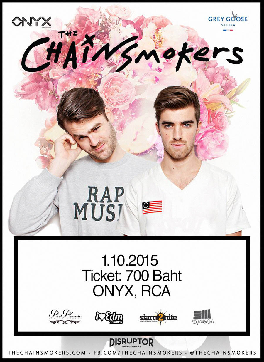 The Chainsmoker เป็นดูโอที่ประกอบไปด้วยสมาชิก 2 หนุ่มต่างอาชีพอย่าง Drew (โปรดิวเซอร์) และ Alex (ดีเจ) บนพื้นฐานของความหลงใหลในดนตรีแนวอิเล็คทรอนิคส์ (EDM) ของทั้งคู่ โดยเปิดตัวอย่างเป็นทางการครั้งแรกในปี 2012 และได้โด่งดังสุดๆกับเพลง #SELFIE ในปี 2014 ที่ตอนนี้ยอดวิวในยูทูปทะยานเกิน 460 ล้านวิวเรียบร้อยแล้ว