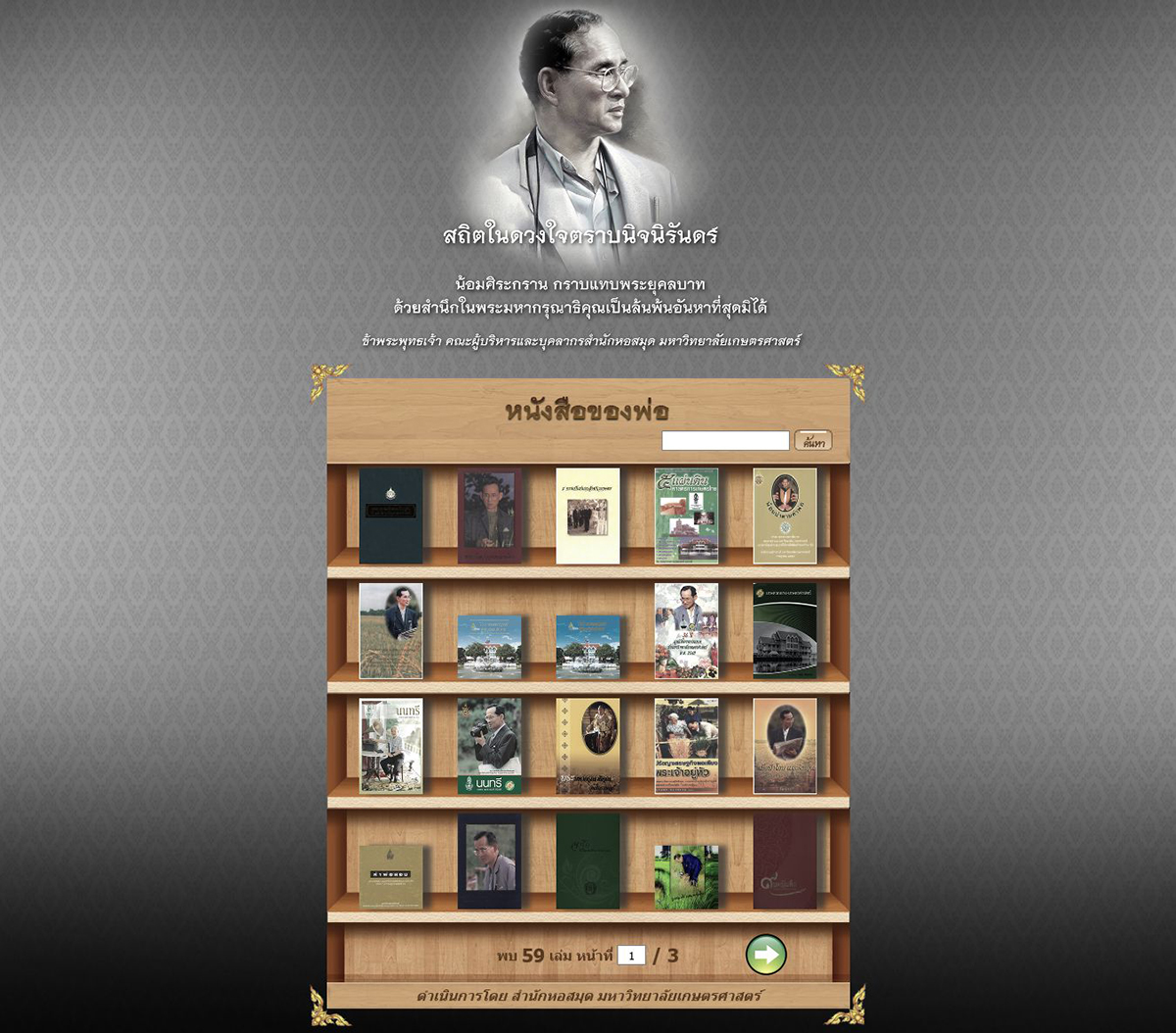 สำนักหอสมุด มหาวิทยาลัยเกษตรศาสตร์ จัดทำชั้นวาง หนังสือของพ่อ ฉบับออนไลน์ รวบรวมพระราชประวัติ พระราชจริยวัตร และพระราชกรณียกิจต่างๆ ของ ในหลวง รัชกาลที่๙ ในรูปแบบหนังสืออิเล็กทรอนิกส์ (e-book) จำนวนทั้งหมด ๕๙ เล่ม เพื่อเฉลิมพระเกียรติ พระบาทสมเด็จพระปรมินทรมหาภูมิพลอดุลยเดช ที่มีพระมหากรุณาธิคุณอันหาที่สุดไม่ได้ ต่อปวงชนชาวไทย และถือเป็นอีกหนึ่งช่องทางที่เปิดให้ประชาชนได้ศึกษาข้อมูลเกี่ยวกับพระองค์ท่าน ได้ทุกที่ทุกเวลา โดยไม่มีค่าใช้จ่าย