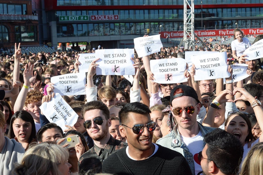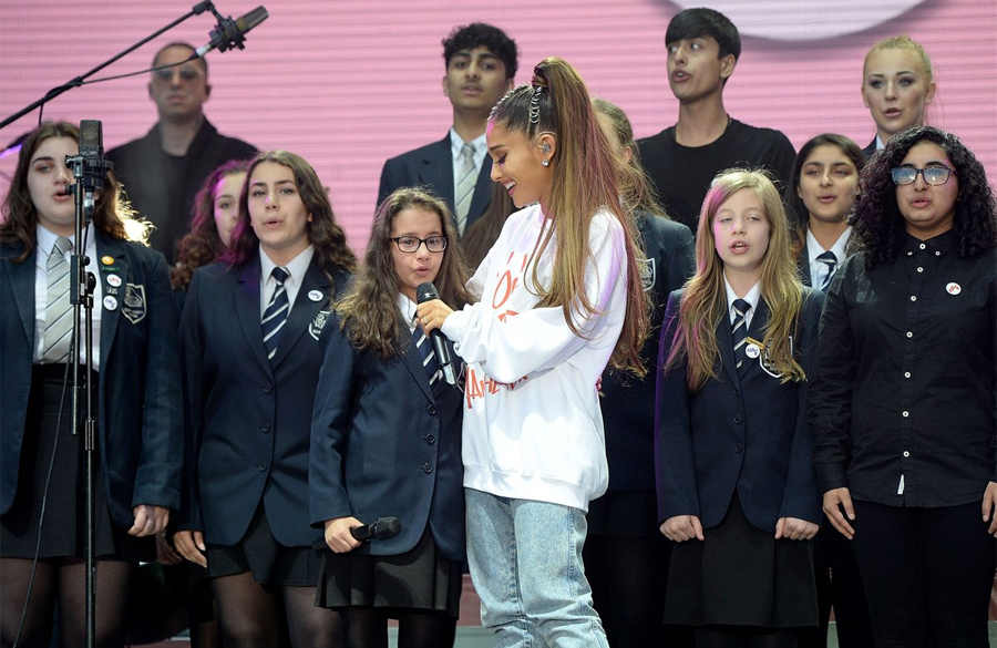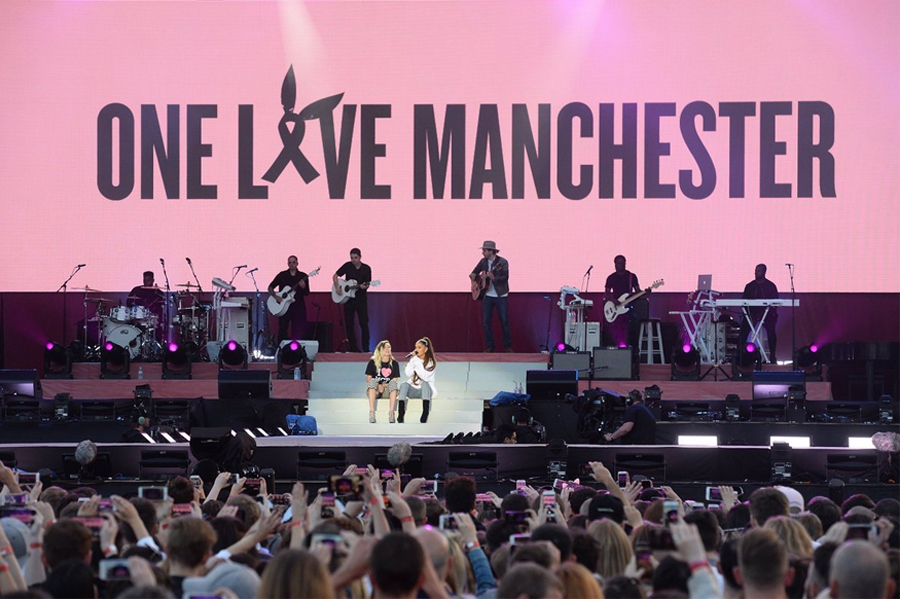 โดยคอนเสิร์ตOne Love Manchester ก็ได้ถือกำเนิดขึ้นจากความตั้งใจของเธอที่จะใช้ “ความรัก” ในการเอาชนะ “ความเกลียดชัง” ของผู้ก่อการร้าย โดยเธอได้ชักชวนบรรดาศิลปินชื่อดังอย่าง Robbie Williams, Miley Cyrus, Pharrell Williams, Niall Horan, Katy Perry, Little Mix, Justin Bieber, Coldplay และ Mac miller ร่วมขึ้นโชว์ ทั้งนี้เพื่อนำรายได้ทั้งหมดส่งมอบให้กับครอบครัวและผู้ที่ได้รับผลกระทบจากเหตุการณ์ก่อการร้ายในวันนั้น