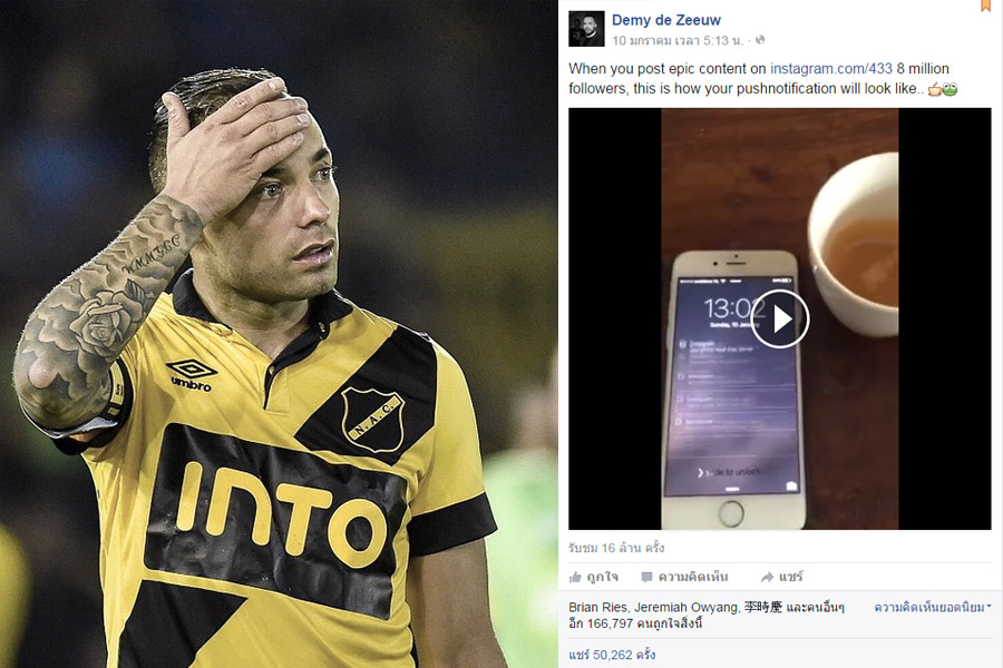 ล่าสุดเมื่อ 10 มกราคม 2559 Demy de Zeeuw นักฟุตบอลชื่อดังทีม NAC Breda ได้อัพโหลดวิดีโอลงใน แฟนเพจของเขา ซึ่งภายในคลิปวิดีโอสั้นๆความยาว 39 วินาทีนั้น แสดงให้เห็นพายุของฟีด Notifications ที่กระหน่ำขึ้นเตือนใน Instagram หลังจากที่แอคเคาท์อินสตาแกรม @433 ที่มีจำนวนผู้ติดตามถึง 8 ล้านคนได้อัพภาพลง