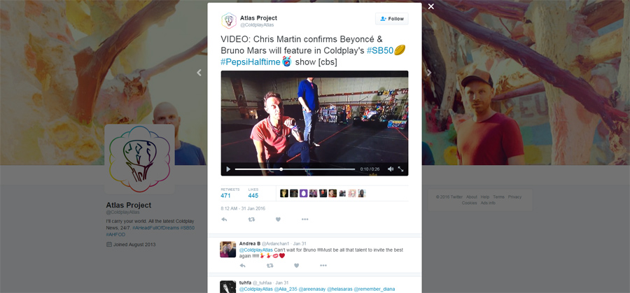 และล่าสุดได้มีคลิปสั้นๆที่ทวีตผ่านแอคเคาท์ของวง Coldplay เป็นคลิปที่คริส มาร์ตินนักร้องนำวง Coldplay ได้ให้สัมภาษณ์ระหว่างซ้อมแบบตลกขบขันไว้ว่า “นี่อาจจะเป็นรอยเท้าของบียอนเซ่ เธออยู่ที่นี่เมื่อ 4 ชั่วโมงก่อน แล้วลองมองหาบรูโน่ มาร์สอีกคนนึงสิ” จึงทำให้เกิดเสียงวิพากษ์วิจารณ์กันเกิดขึ้นว่า บียอนเซ่และบรูโน่ มาร์สจะมาปรากฏตัวจริงหรือเปล่าเพราะทั้งสองนั้นเคยขึ้นโชว์ใน Halftime มาแล้วและได้สร้างความประทับใจให้ผู้คนเป็นอย่างมาก การมาร่วมฟีทเจอริ่งกับ Coldplay ครั้งนี้ย่อมสร้างความเซอไพรส์แก่แฟนๆไม่ใช่น้อย