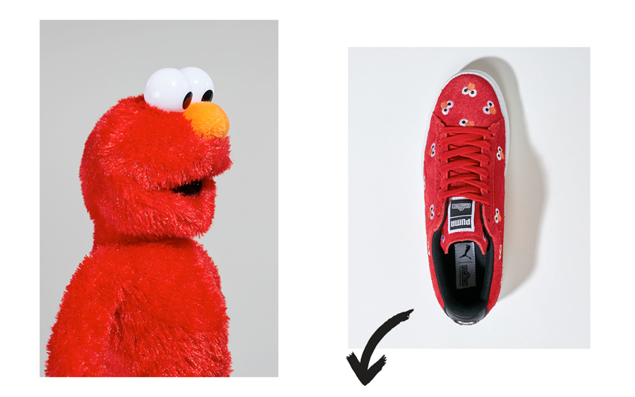 • PUMA x Sesame Street Suede เป็นสนีกเกอร์หนังกลับที่โดดเด่นด้วยใบหน้าของ Cookie Monster และ Elmo โดยซีรีย์นี้มีด้วยกัน 2 สีคือสีแดงและสีฟ้า